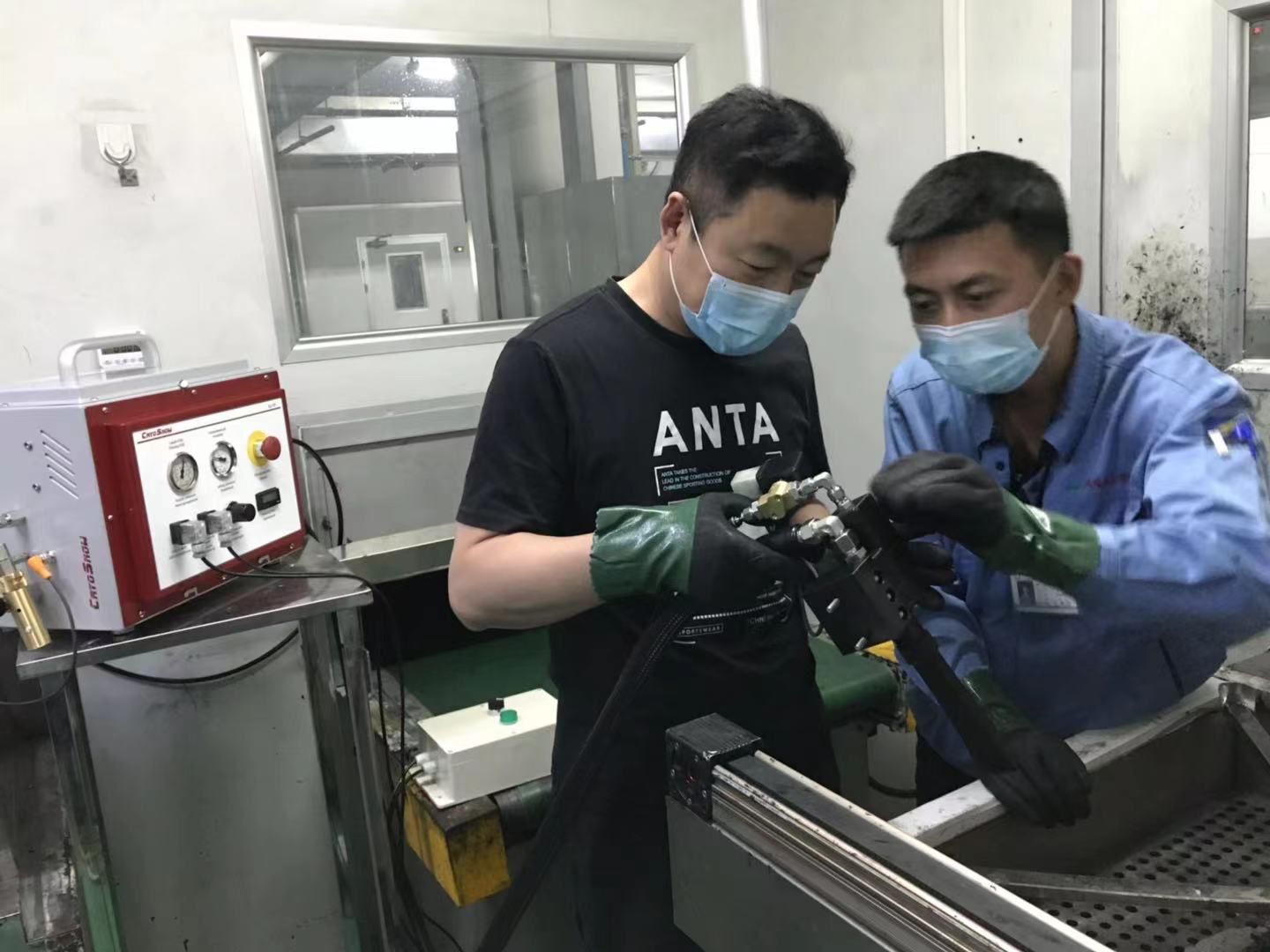 該圖片是CryoMatic二氧化碳雪清潔解決方案的展示。汽車塑料擋泥板上有明顯的灰塵,油污等雜質,液態(tài)CO2可以快速去除污垢,完全滲透到表面,不留下任何殘留物,無二次污染。整套雪花清洗系統(tǒng)是液態(tài)CO2儲罐通過增壓泵將液態(tài)CO2在多重過濾,恒溫的措施下連接到機械臂上,再通過特殊陣列式噴嘴噴出清洗零部件。CryoMatic 二氧化碳雪清潔解決方案是上海思巴克智能科技有限公司多年的干冰清洗技術的最新技術